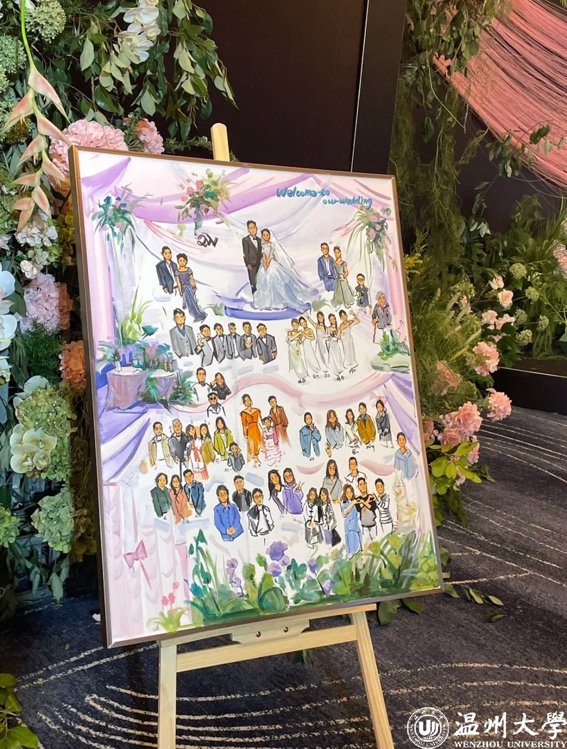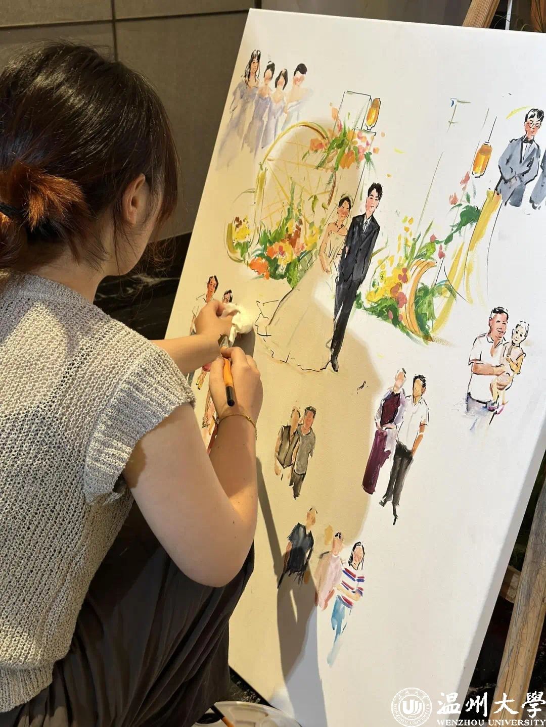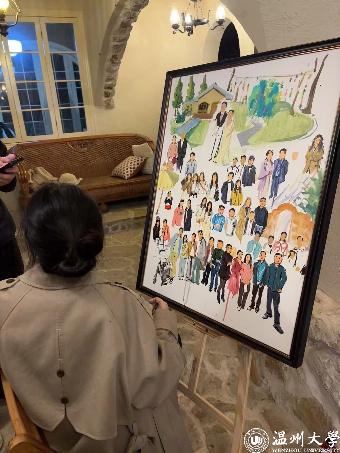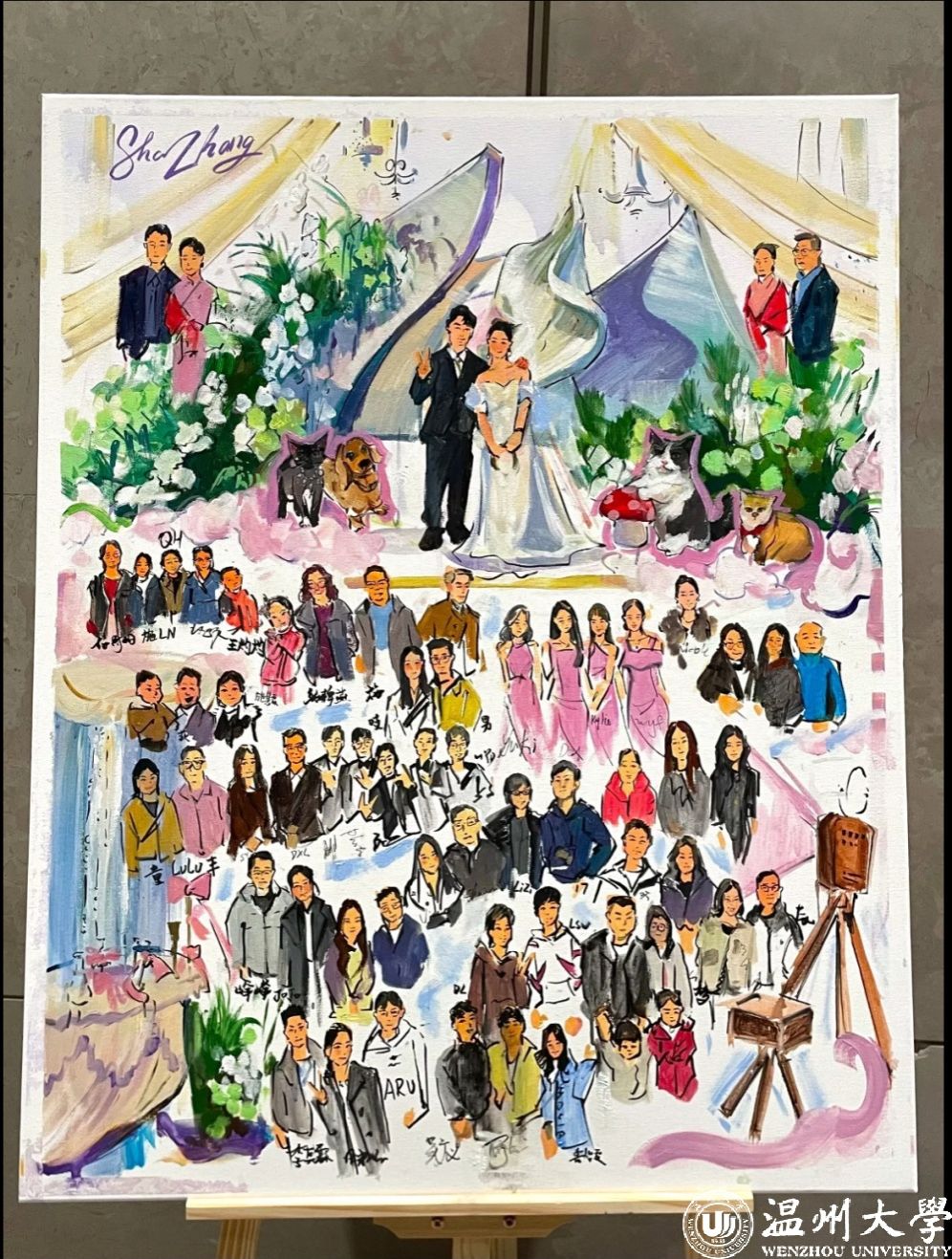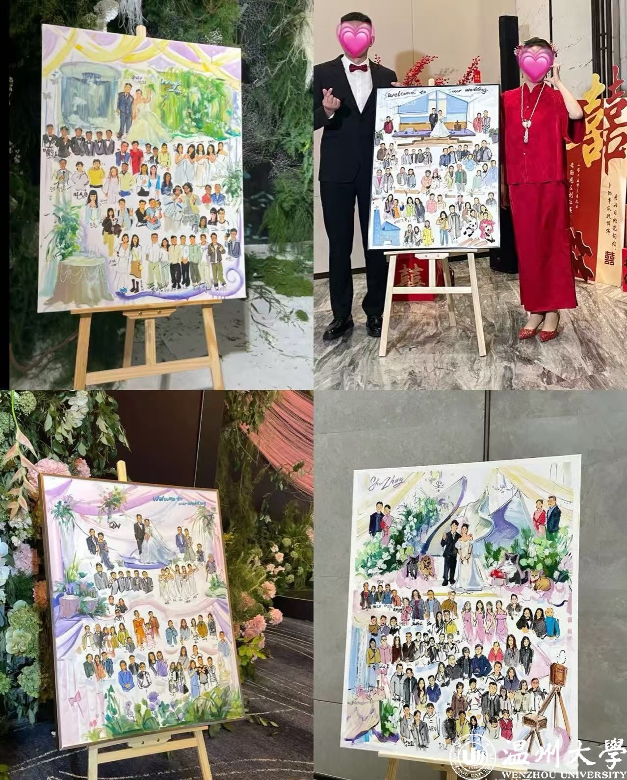 唯有事先进行绘画准备,待新人抵达后,依据现场的具体细节进行捕捉,方能创作出优秀的作品。例如,捕捉新人60余位亲朋好友在不同时间点的微妙表情,并在作品呈现后,让每位亲朋好友亲自签名;又如,将无法亲临婚礼现场的宠物也融入画作之中。