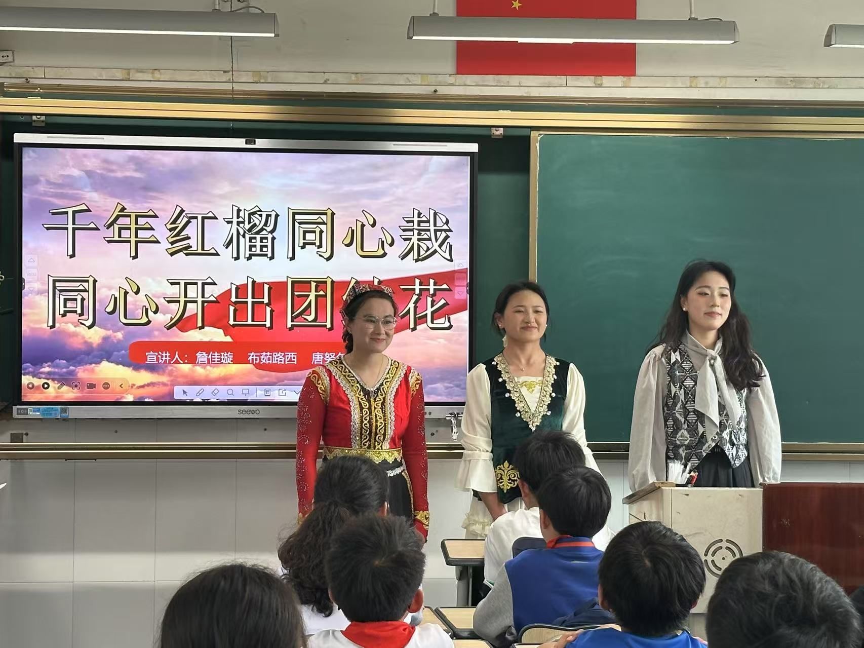 “民族团结我来学”环节中,在青年宣讲员的带领下,孩子们争先恐后地用藏语、维吾尔语说出人生第一句民族语问候。伴着《麦西来普》的鼓点,迈着新疆舞步,民族青年牵着孩子们旋出同心圆,四十平方米的教室瞬间化作艺术的万花筒,清脆的笑声如浪花般在教室里层层荡漾。