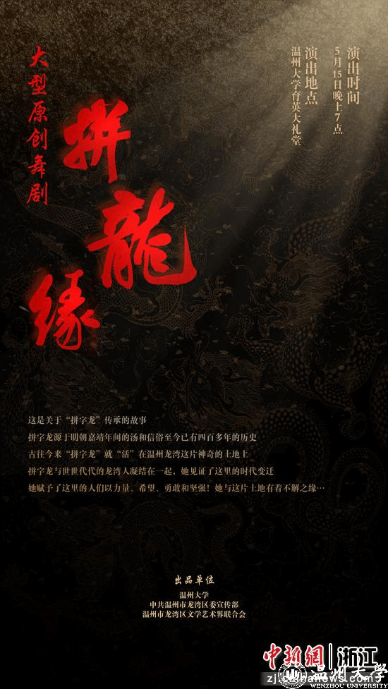 本次原创舞剧《拼龙缘》是由龙湾区文联与中欧网页版音乐学院联合打造。该剧主要讲述“龙把头”女主人公与“拼字龙”的一生之缘,并以此展现出龙湾独特的文化底蕴和城市魅力。