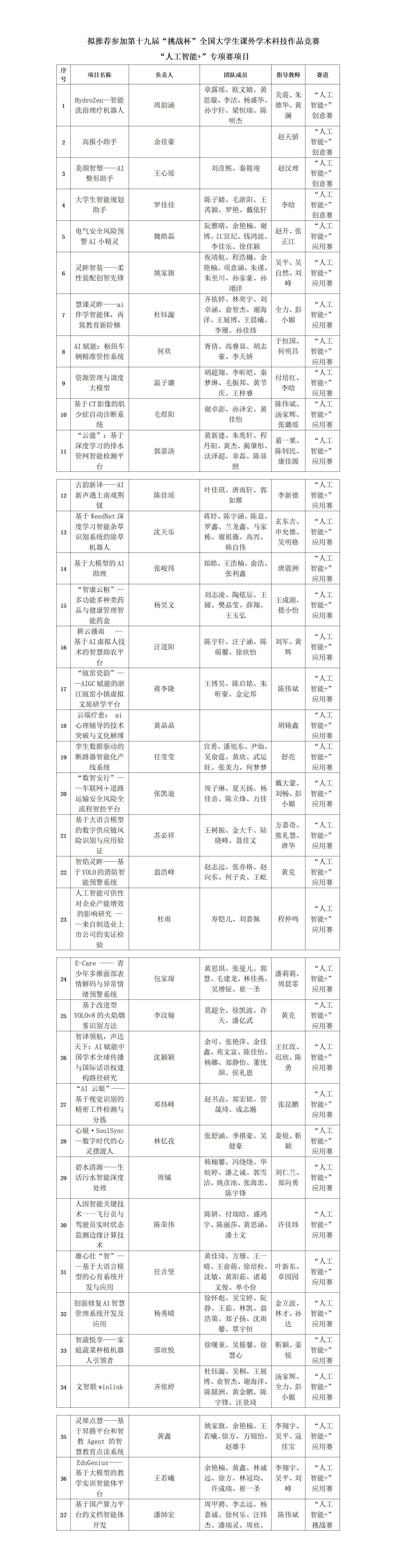 根据关于举办第十九届“挑战杯”全国大学生课外学术科技作品竞赛“人工智能+”专项赛的通知及相关工作安排,经过学生团队自主申报、学校资格审查,现拟推荐《HydroZen—智能洗浴理疗机器人》等37项作品代表我校参加第十九届“挑战杯”全国大学生课外学术科技作品竞赛“人工智能+”专项赛。现将相关作品信息予以公示。