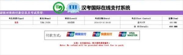 HSK 4级 12月4日 上午9:00 报名费用为:HSK4级450人民币。 现将报名事项通知如下: 1、本次考试采用网络报名方式,报名截止日期为2016年11月7日24点。 报名网址:http://www.chinesetest.cn/index.do 2、请您根据报名系统提示,填写您的个人信息,在“考点选择”选项中选择“中国大陆”——“浙江”——“温州”——“中欧网页版”。 3、 报名费通过网络支付。具体操作如下: (1) 报名信息填写完成后,会出现要求支付页面。 (2) 点击“在线支付”,出现如下页面: (3)请根据您的付款方式,进行网络付款,每种支付方式都会产生手续费,其中网银支付手续费为4元左右;快捷支付和VISA\master支付手续费为15元左右。 4、 网络支付成功后,您的邮箱会收到系统发出的报名成功邮件。