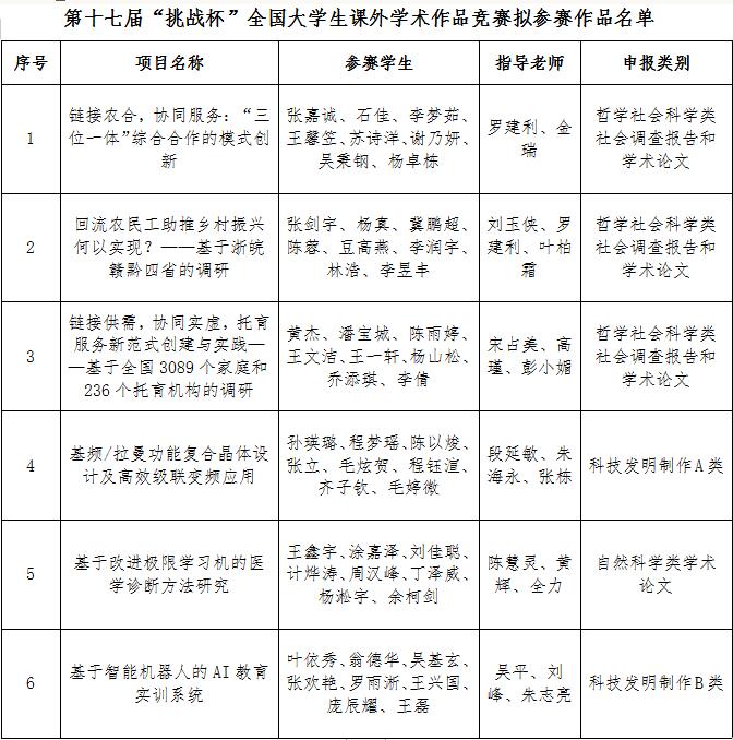 根据第十七届“挑战杯”全国大学生课外学术科技作品竞赛《竞赛章程》的相关要求和申报程序,经学生申报、学校选拔、浙江省评审,现拟推荐《链接农合,协同服务:“三位一体”综合合作的模式创新》等6项作品,代表我校参加第十七届“挑战杯”全国大学生课外学术科技作品竞赛,现予以公示。