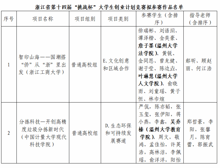 根据《关于举办浙江省第十四届“挑战杯”大学生创业计划竞赛的通知》相关要求,经浙江工商大学、中国计量大学现代科技学院“挑战杯”院赛、校赛等两次公开、公正、公平的选拔,现拟推荐作品《智印山海——国潮搭“侨”从“浙”里出发》、《分拣科技—开创高精度垃圾分拣新时代》参加浙江省第十四届“挑战杯”大学生创业计划竞赛,参赛团队中詹子墨、叶琳慧、吴乔榛为我校学生。现将相关作品信息予以公示。