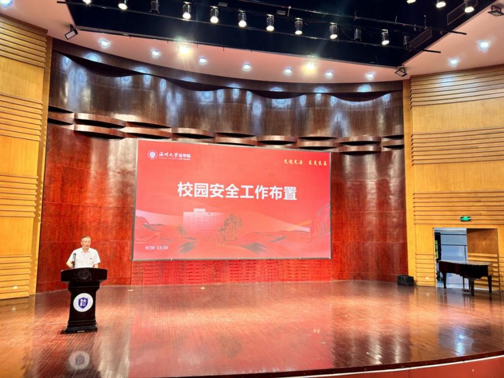 法学院党委书记林钦作校园安全工作布置。他重点提醒各位教师应注重消防、交通、水电、保密、毒品、心理健康、意识形态、财产安全,禁止存放易燃、易爆等危险物品,全力保障亚运会期间校园安全稳定。