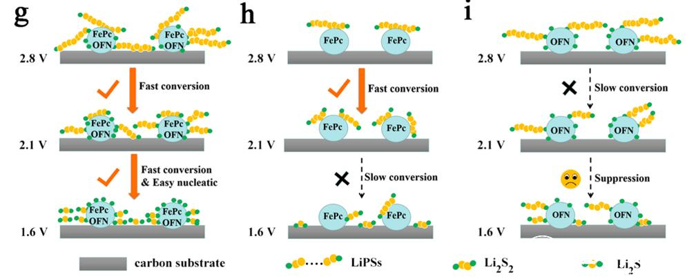 During the sulfur conversion process in a lithium-sulfur battery, a series of multiple reactions and complex solid-liquid-solid heterogeneous conversion are required. Therefore, the author proposes a “dual-control conversion model”, which uses artificial mimic enzymes iron phthalocyanine (FePc) and octafluoronaphthalene (OFN) to selectively mediate the conversion of long-chain polysulfides (S8→Li2S4) and short-chain polysulfides conversion (Li2S4→Li2S). A series of in-situ spectroscopy, XPS and DFT are used to study the internal sulfur conversion mechanism of lithium-sulfur batteries. The results show that FePc can effectively anchor and shear long-chain polysulfides through the coordination of Fe∙∙∙S; while OFN promotes the lithium bond with polysulfides and accelerates the Li2S Liquid-solid nucleation and growth kinetics. The dual control system promotes the solid-liquid-solid sulfur conversion reaction to proceed smoothly, and significantly improves the electrochemical performance of the battery.
