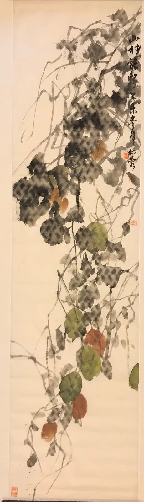 陈柳蓉是一个对生活充满热情,对艺术有着执着追求的画家,她应浙江日报邀请,为上虞盖北葡萄基地创作了一幅葡萄写意画。葡萄是花鸟画中比较难表现的内容,如同牡丹一样,色彩容易俗气,要画出高雅的格调有一定的难度。她让葡萄酒在锅里蒸发,让它浓缩成稠密精华然后调上颜色,再加入一种碱,表现出来的色彩变化丰富,紫中带蓝,这种着色使得葡萄的颜色显得即厚重又沉稳,这幅画看上去既有高雅的格调,色彩漂亮,也更富有神韵。藤蔓线条老而拙,错综有致,表现出丰富的层次感,叶片与藤蔓及葡萄之间的关系非常自然,疏密有致,让人感觉赏心悦目!