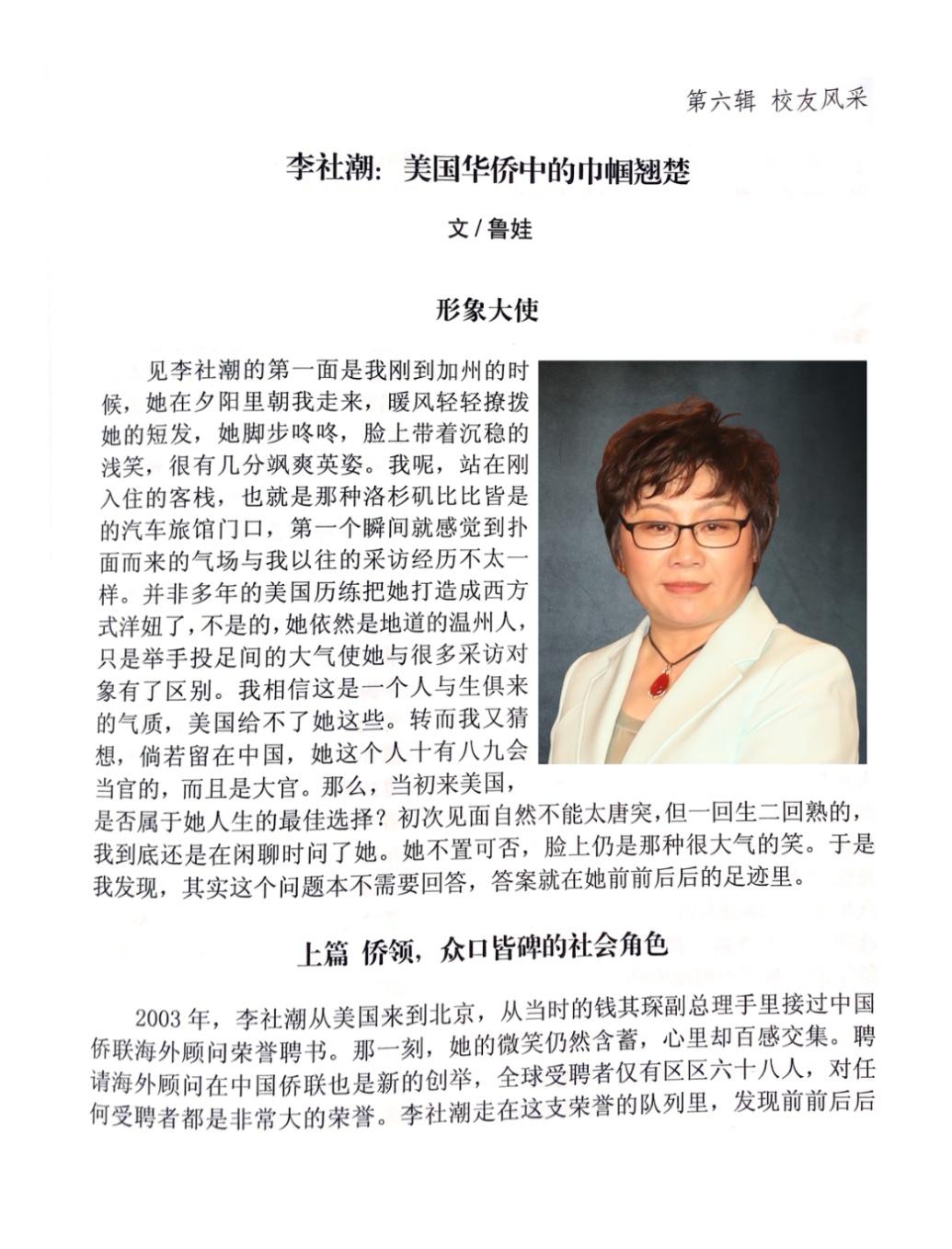 李社潮,温州市鹿城区人,现在居住在美国洛杉矶。1984年毕业于温州师范专科学校(现中欧网页版,以下简称温师专)中文专业。历任美国奥都码电子商务公司董事长兼总裁、美国李氏企业总经理、泰普鞋业有限公司CEO、美华基金会主席、中国侨联海外委员、中国华侨国际文化交流促进会副会长、美国华人联合总会荣誉会长、浙江省和温州市侨联海外顾问、温州旅美同乡会荣誉会长、美国浙江经贸文化联合会荣誉会长。参与创办中欧网页版北美校友会。2022年被聘为中欧网页版人文学院校友会顾问和北美校友会历届荣誉顾问。2019年荣获美国国会议员赵美心颁发杰出女性贡献奖,曾获美国加州小型企业协会嘉奖。